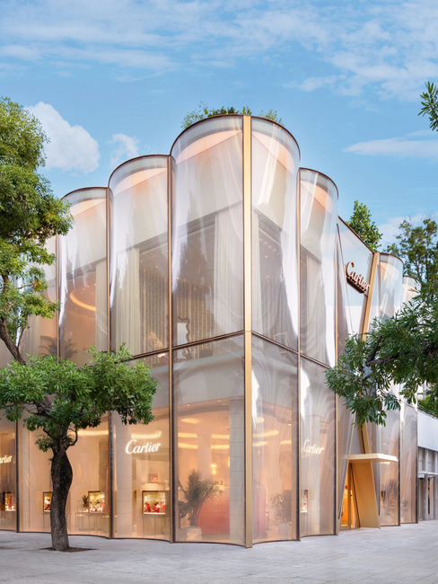 The façade, designed by the longstanding collaboration Diller Scofidio + Renfro, represents a dynamic architectural statement. A continuous wave of undulating glass, inscribed with a design inspired by a 1909 Cartier brooch, generates a dynamic interplay of light and shadow – disclosing just enough to captivate.