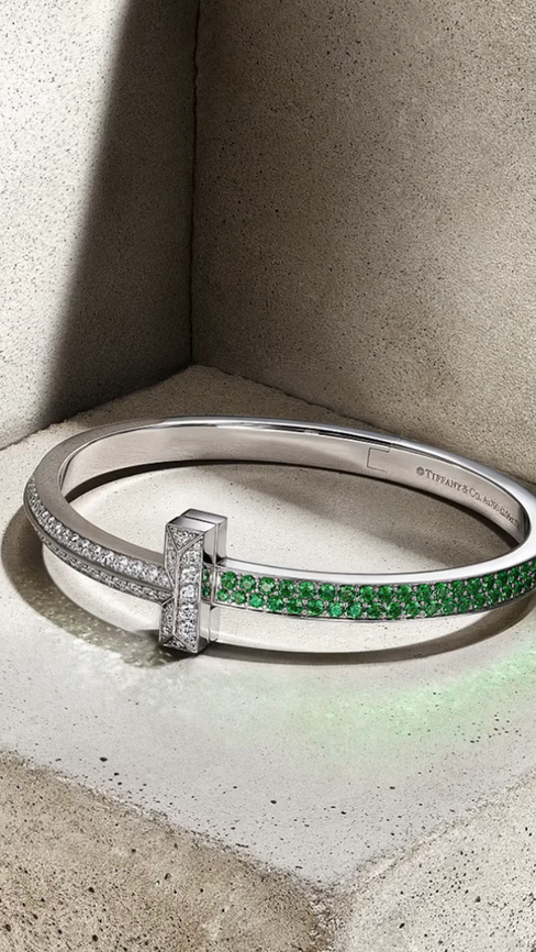 The initial item in the collaboration is a Tiffany T1 bracelet, designed as an homage to the brand's 186-year legacy. The bracelet is constructed from 18k white gold and incorporates over 105 diamonds and more than 74 tsavorites, resulting in a distinctly exquisite appearance. The striking T1 bracelet by Tiffany & Co. is presented within a bust of Venus of Arles.